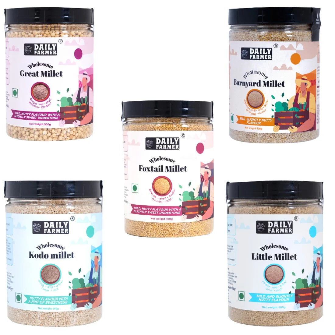 Wholesome Millets Combo 2.5kg (Pack of 5) Little 500g, Kodo 500g, Foxtail 500g, Great 500g and Barnyard 500g