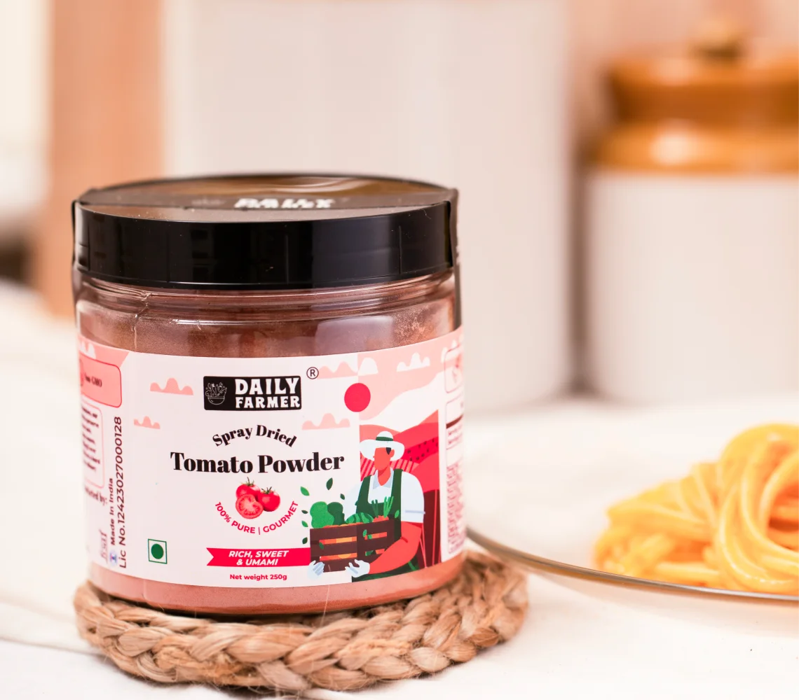 Introducing Daily Farmer's Tomato Powder, a culinary gem that captures the essence of sun-ripened tomatoes in a convenient and versatile form. Crafted with care and passion, our Tomato Powder is the secret ingredient that will elevate your dishes to new heights of flavour. Experience the rich taste and vibrant colour of fresh tomatoes all year round with our Tomato Powder. Sourced from the finest tomatoes, we carefully dehydrate them to preserve their natural goodness, creating a product that's both shelf-stable and bursting with flavour. Incredibly versatile, our Tomato Powder can be used as a base for sauces, soups, stews, and more. Simply rehydrate it with water or add it directly to your recipes for an instant burst of tomato goodness. Its concentrated flavour ensures you get the full essence of tomatoes without any waste. Not only is our Tomato Powder a taste sensation, but it also packs a nutritional punch. It's a natural source of vitamins, minerals, and antioxidants that contribute to a well-rounded and healthy diet. Say goodbye to the hassle of dealing with perishable tomatoes, and hello to the convenience of Daily Farmer's Tomato Powder. With its long shelf life, you'll have the rich taste of tomatoes at your fingertips whenever inspiration strikes. Unlock a world of culinary possibilities with Daily Farmer's Tomato Powder. From homemade pasta sauces to flavourful dips and everything in between, our Tomato Powder will be your secret weapon in the kitchen. Join countless satisfied customers who have made our Tomato Powder a pantry staple for delicious and convenient cooking.